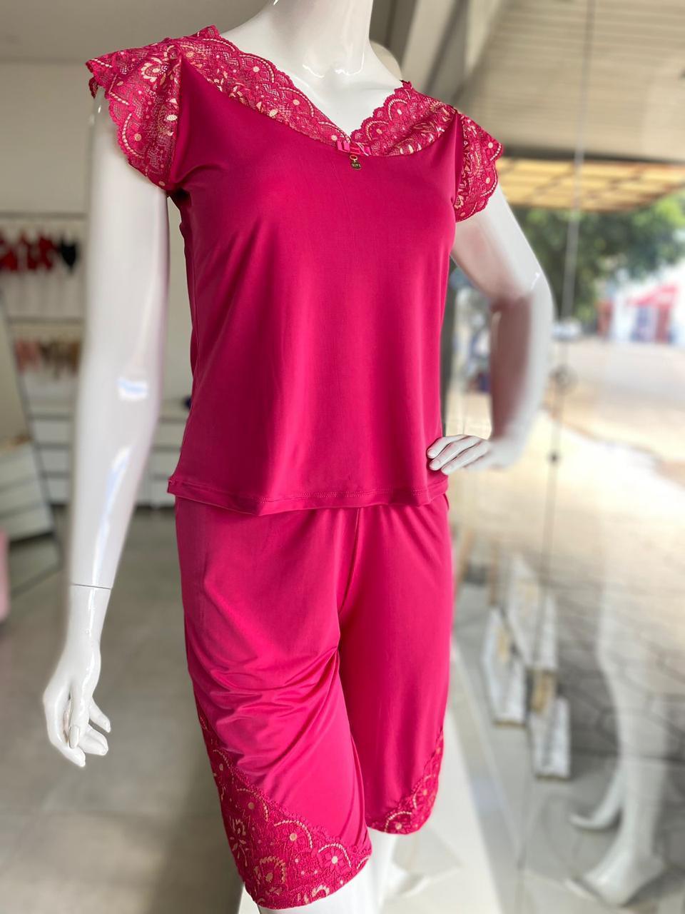 Pijama em ligante com detalhes em renda e alças de manguinha . um short com elástico na cintura confortável que não marca no corpo.